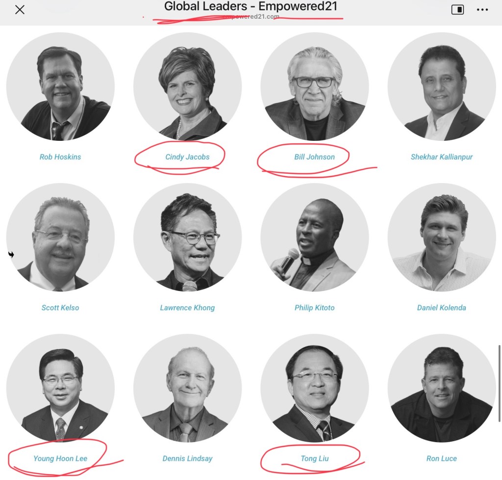 刘彤(Tong Liu) 和比尔.强生(Bill Johnson) 都是一灵恩派组织 Empower 21 的所谓全球领袖,韩国的灵恩派大头目赵镛基的接班人李永勋(Young Hoon Lee)也在其中。看下面截图: