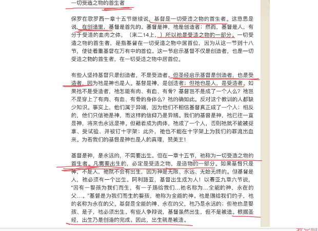 现在回到这节经文,“爱子是那不能看见之神的像,是首生的,在一切被造的以先。” (西1:15)这里说基督是首生的,是在一切被造的以先。也就是说,基督的地位高于一切的被造,是在陈述基督与被造的关系。紧接着的经文对这关系给出了进一步的说明和解释,“因为万有都是靠他造的,无论是天上的,地上的,能看见的,不能看见的,或是有位的,主治的,执政的,掌权的,一概都是借着他造的,又是为他造的。”(西1:16)西1:15的意思乃是西1:16所说的,一切的被造都是借着基督造的,又是为祂造的,祂乃是一切受造的掌管者,而不是说基督也是受造者。