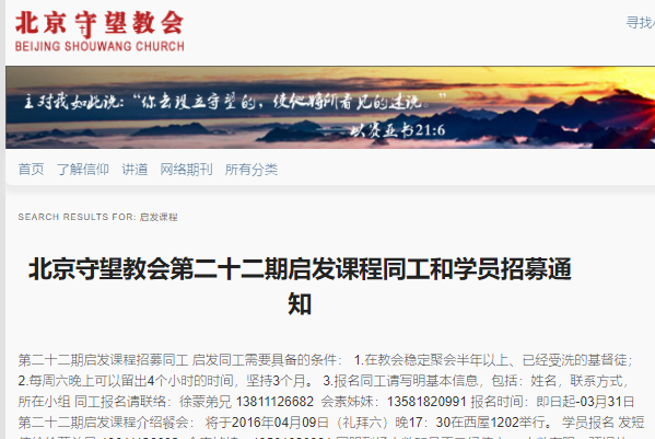 启发课程也在华人教会里广为流传,北京的守望家庭教会可能是大陆里比较早引进和开办启发课程的教会之一。据守望教会网站介绍,他们大约在2003年就先从香港引进了启发课程的相关书籍和影音资料,2006年10月开办第一期启发课程,到2016年已开办了22期,见下面截图: