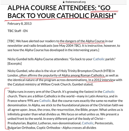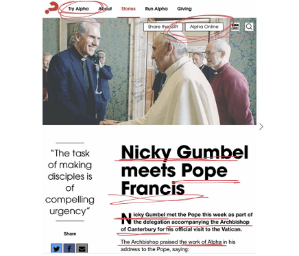 “Alpha runs in every arm of the Church. It’s growing the fastest in the Catholic church. There are a billion Catholics in the world—many in Latin America, and in France where 99% are Catholic. But the course runs exactly the same no matter the denomination. In Alpha, we stick to the foundational pieces of the Christian faith we all agree upon: Jesus, the cross, the resurrection, the Bible, prayer. What unites us is infinitely greater than what divides us. We focus on what unites us. We present a united front to the world. In every different part of the body of Christ—Presbyterian, Baptist, Lutheran, non-denominational, Catholic, Pentecostals, Bulgarian Orthodox, Coptic Orthodox—Alpha crosses all divides ” (原文截图附在文后)