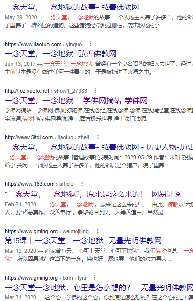 “一念天堂,一念地狱 ” 这是佛教非常普及的用语和观念,有多普及呢?看看下面这张截图,是我用Google搜索这句话显示的结果里的前面几条,几乎都是导向佛教网站: