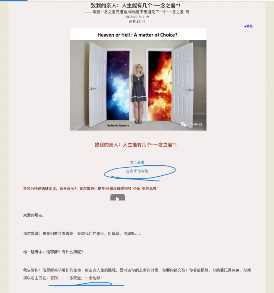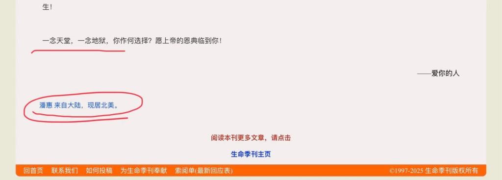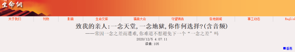 2020年12月5日,生命季刊发表了一篇文章:《致我的亲人:一念天堂,一念地狱,你作何选择?(含音频) —— 常因一念之差而遭难,你难道不想避免下一个“一念之差”吗》,作者:潘惠。文章标题部分的截图如下: