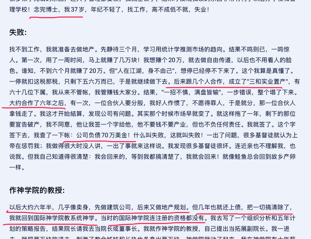 2007年,唐崇怀写了一篇文章《教会妇女圣职的再思和商榷》,在这篇文章里,唐崇怀说,“筆者承膺聖職事主四十多年”(原文截图附在文后,附图5)。根据上面的分析和计算,唐崇怀哪来的有四十年的圣职呢?2007年,唐崇怀 65岁,扣除他14年的生意人生,和8年的美国学生日子,这就是22年了,如果他还有四十几年承担圣职,那他就得从婴儿时期就开始担任圣职了,够荒唐了吧!如此言过其实地吹嘘自己的属灵成就,这究竟是在欺哄人,还是欺哄神呢?