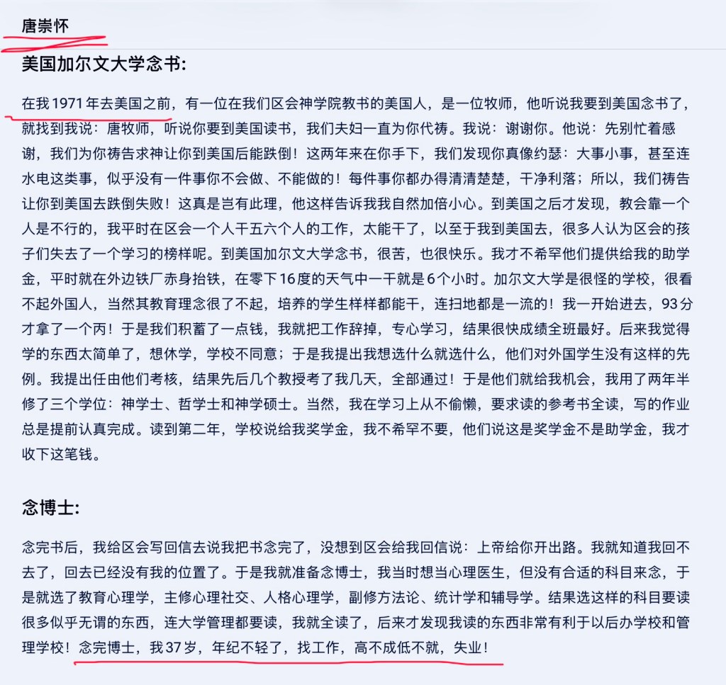 唐崇怀(唐崇荣的弟弟)1942年出生,1971年,也就是他29岁时,从印尼来美国留学,就读于加尔文大学,南加州大学。一直到他37岁(1979年)才结束学生生涯。走出美国校园后,唐崇怀并不是从事教会的事工,也不是在神学院教书。据他自己说,先是静观3个月,用6个月在市场上赚了一笔钱,接着先与人合作,做了大约7年的地产,结果以失败告终,欠了70万美元。为了还债,他又是做建筑公司,又是地产规划,这一做又是6.5年。这样说来,唐崇怀走出校门后,在生意场上摸爬滚打了14年多。等他离开生意场,已是大约52岁。可以说,唐崇怀最好的时光并不是在基督教界里渡过,不是在牧会,也不是在教神学,而是在生意场上耗掉的(可参见附图1,《唐崇怀自述个人简历》)。