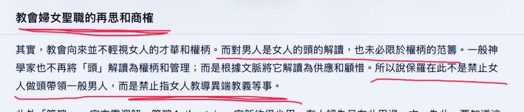 其实,教会向来并不轻视女人的才华和权柄。而对男人是女人的头的解读,也未必限于权柄的范筹。一般神学家也不再将“头”解读为权柄和管理;而是根据文脉将它解读为供应和顾惜。所以说保罗在此不是禁止女人做头带领一般男人,而是禁止女人教导异端教义等事。(原文截图如下)