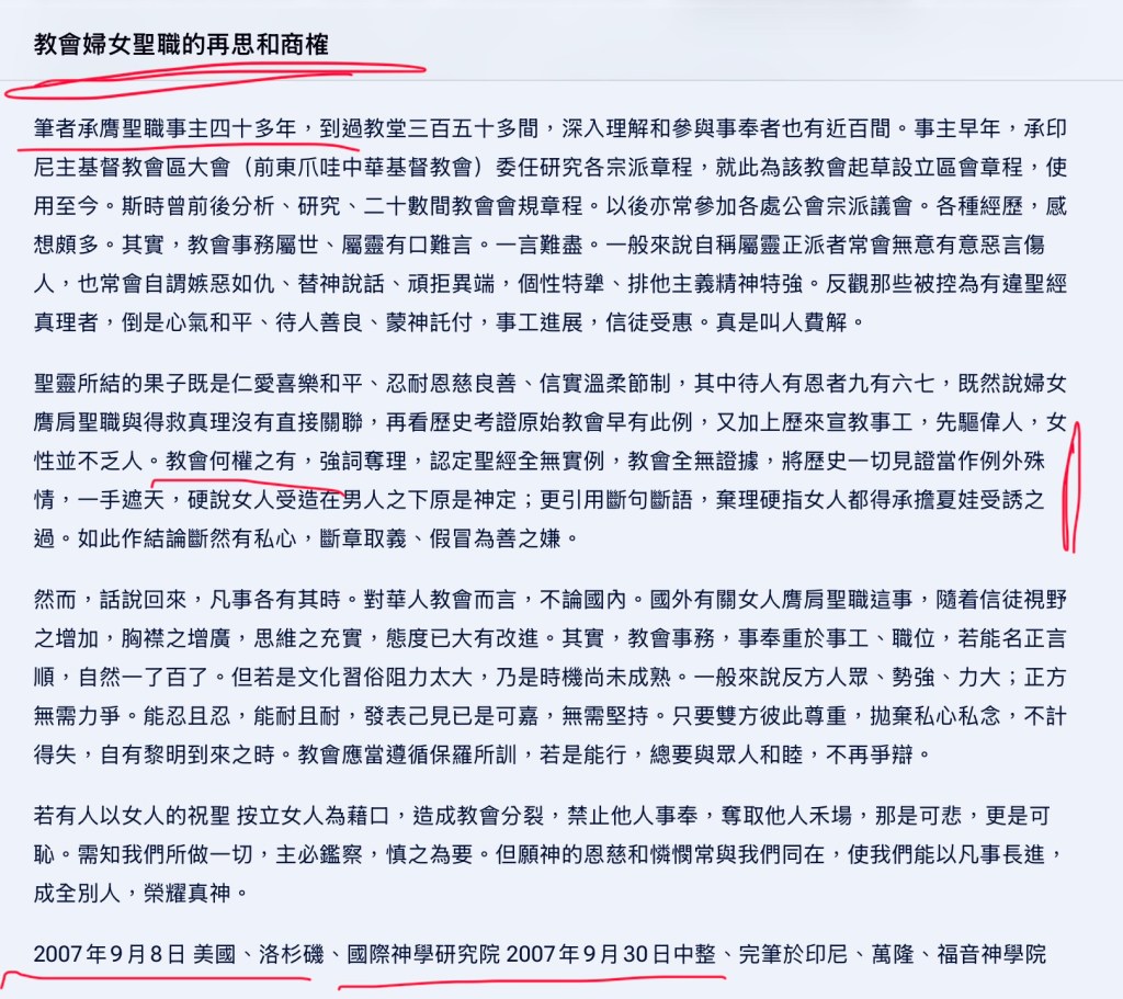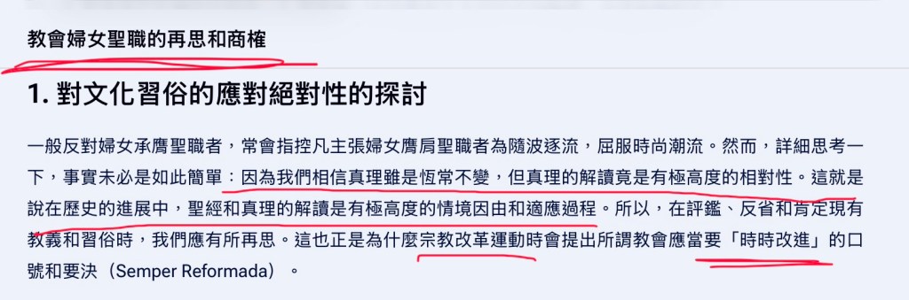 我们相信真理虽是恒常不变,但真理的解读竟是有极高度的相对性。这就是说在历史的进展中,圣经和真理的解读是有极高度的情境因由和适应过程。所以,在评鉴、反省和肯定现有教义和习俗时,我们应有所再思。(原文截图如下)