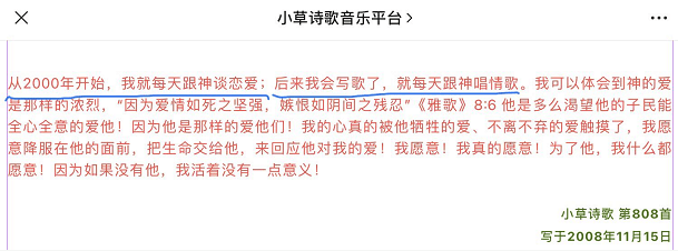 《小草诗歌》的作者林英自称,“从2000年开始,我就每天跟神谈恋爱,后来会写歌了,就每天跟神唱情歌。”(见下面截图)如此看来,林英把耶稣当成了她谈恋爱的对象,她的歌只是她个人的情歌而已。