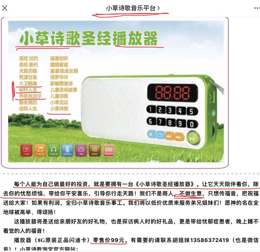 一台《小草诗歌圣经播放器》就能除忧愁烦恼,给予平安喜乐,还能引导走天路,简直可以取代神了。如此夸大其词的推销是很不诚实的,一面说不做生意,一面又采用生意人不诚实的广告行为,把播放器吹捧得如此神奇,这岂不很讽刺?