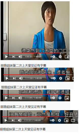 杜丽艳说她不只是一次去过天堂,她说,她父亲去世后,因为太想念她父亲了,就又一次到了天堂的门口,看见了她父亲,同时看到天堂里还有一些因为穿的衣服和裤子很短小、很蒙羞、很丑陋的人。她的《第二次上天堂见证》视频截图: