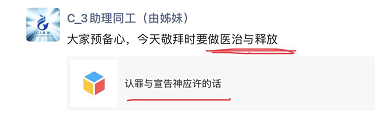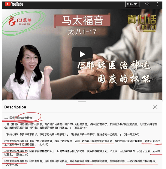 C3 灵修的问题还不只是剽窃和欺骗,由于所用的资料是四处搜集拼凑出来的,所以连错谬的东西他们也拿来用。比如,异端成功神学的医治和释放的宣告,也就是所谓的信心宣告/信心话语(Word of Faith),C3灵修不仅发表在公号里(见下面截图),也发在陈詠洁做的视频里(见下面截屏)。