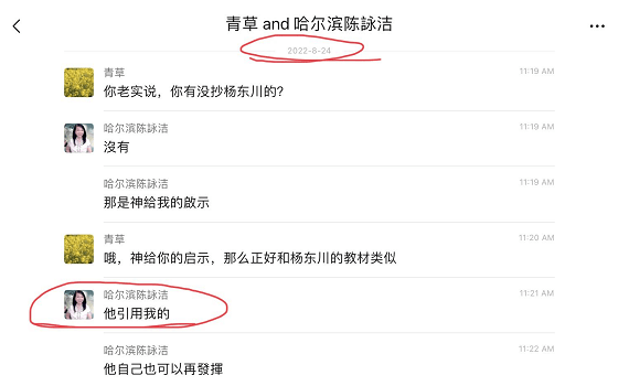 (小草注:2022年8月24日,陈詠洁跟我说她没有抄杨东川的,她说是神给她的启示。她说是杨东川引用她的。杨东川的内容比陈詠洁的多很多,而陈詠洁的就只是一些要点,而且这些要点杨东川的文字里都有,她说那是杨东川再发挥的。那么究竟是谁抄谁的呢?据于这些其实也不难判断出真相了 。下面就是我和陈詠洁就这个问题的对话记录,就附加在此。
