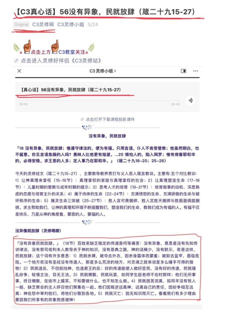 陈詠洁的其他一些节目,也是不加说明地拿别人的东西来念念。在C3灵修小组的微信·公号上有一篇叫着《没有异象,民就放肆(箴二十九15-27)》,标为是C3灵修网的Original(原创),截图如下: