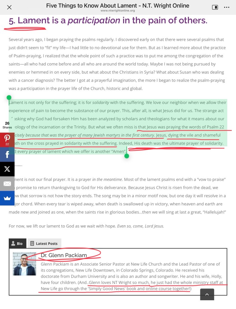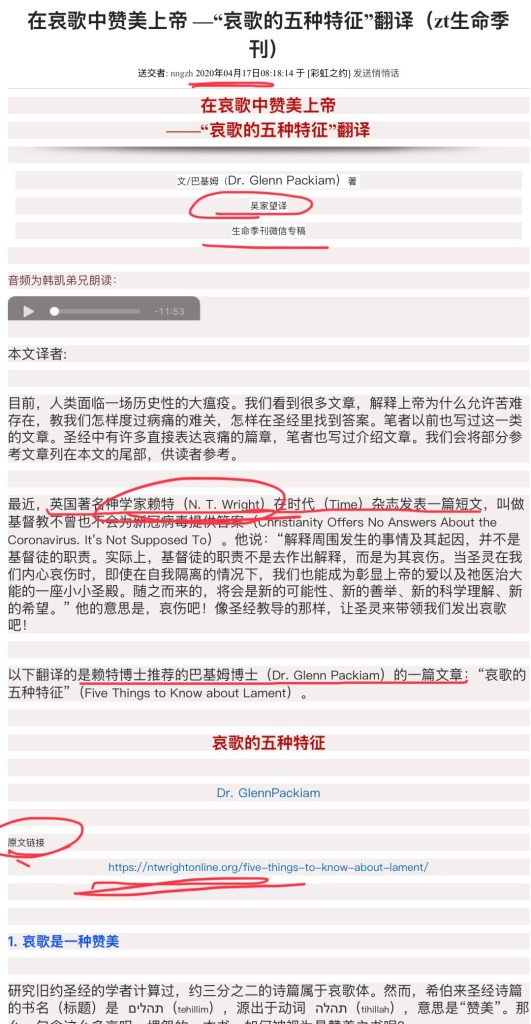 生命季刊于2020年4月17日发表了一篇吴家望翻译的文章《哀歌的五种特征:在哀歌中赞美上帝》。英文原文是发表在赖特的网站上,原文题目为《Five Things to Know About Lament》,原作者是 巴基姆(Dr. Glenn Packiam ),此人是赖特的超级粉丝。下面是赖特网站上的原文截图: