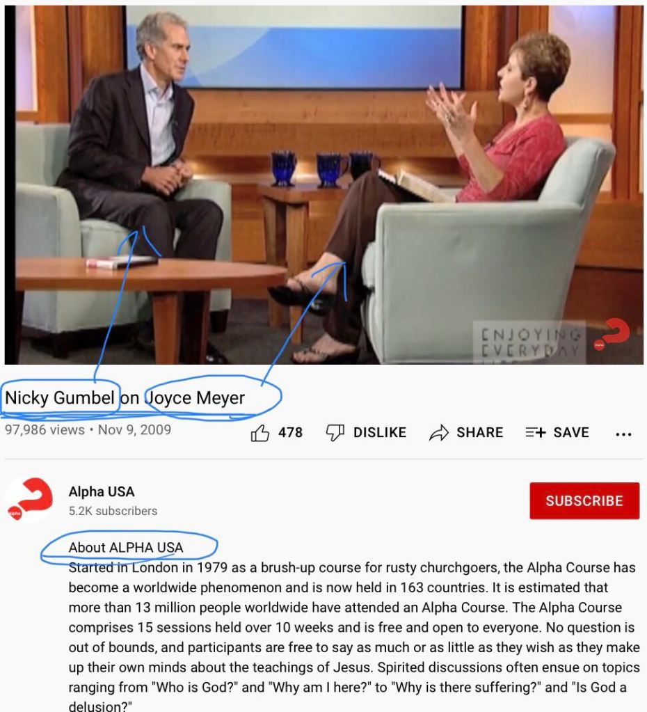 甘力克不只是与天主教走到一起,他还曾上假师傅乔伊斯.迈尔(Joyce Meyer, 也译乔依斯·迈尔,乔依斯·梅尔) 的节目, 并把节目视频发在Alpha (启发课程)的频道里,见下面节目视频截图: