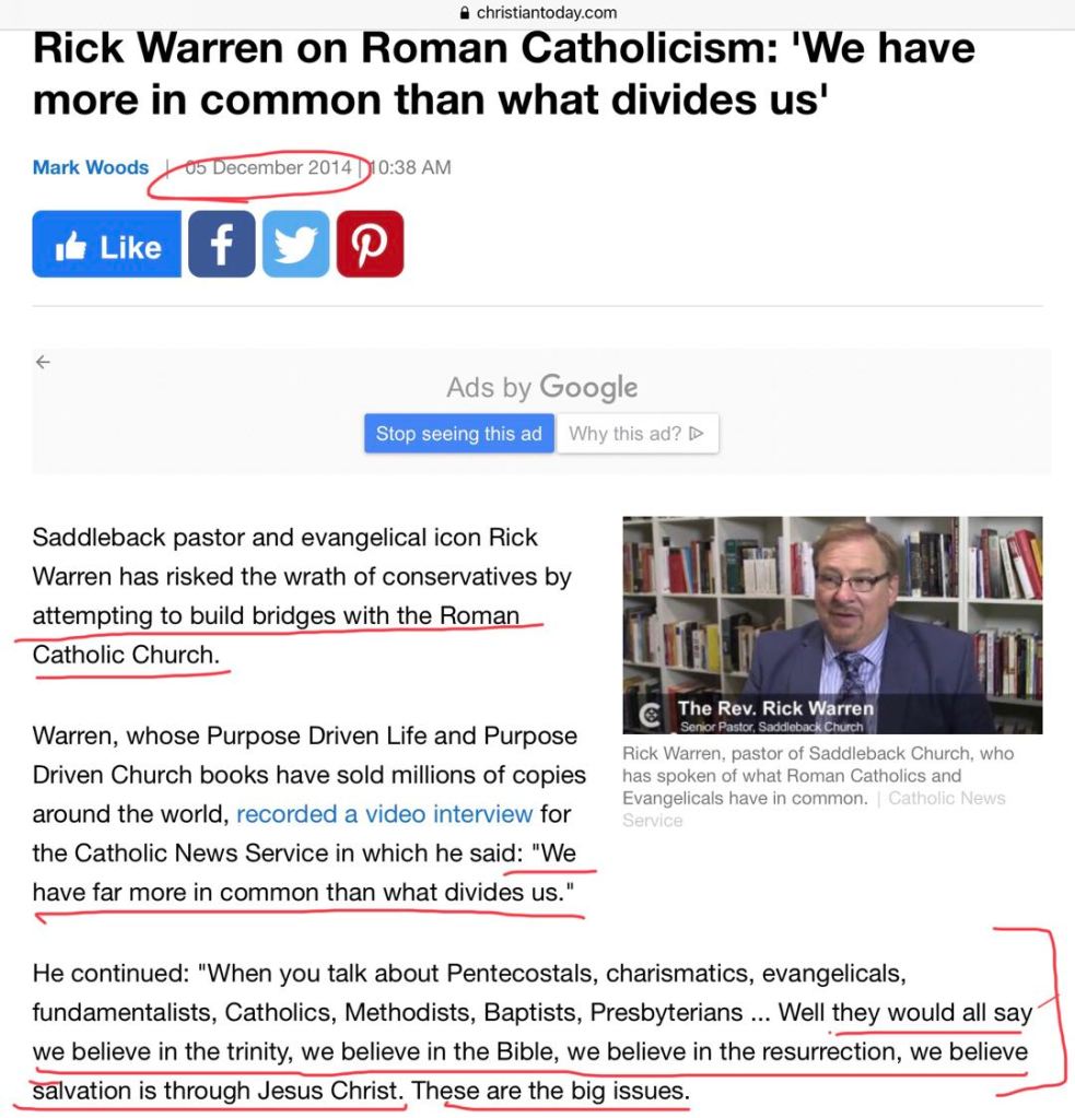 华理克和甘力克一样,都是欣然接受天主教与天主教联合的人士。2014年12月,《Christian Today》有篇报道:《Rick Warren on Roman Catholicism: ‘We have more in common than what divides us’》(华理克谈天主教:‘我们的共同点多于那些导致分裂的地方’),报道截图如下: