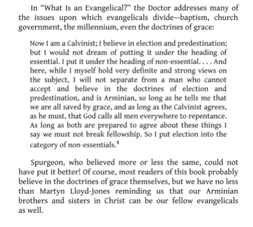 虽然我本人对这个问题持有很明确和坚定的观点,但对于一个不能接受和相信拣选和预定教义的阿民念主义者,我并不会因此与他分离,只要他告诉我,我们都是因神的恩典而得救。只要加尔文主义者赞同,也是必须赞同的,神呼召各地的人都要悔改。只要双方在这些事情有一致的观点,那么我们就决不能断绝团契。因此,我将拣选和预定的教义归于是非基要的类别。