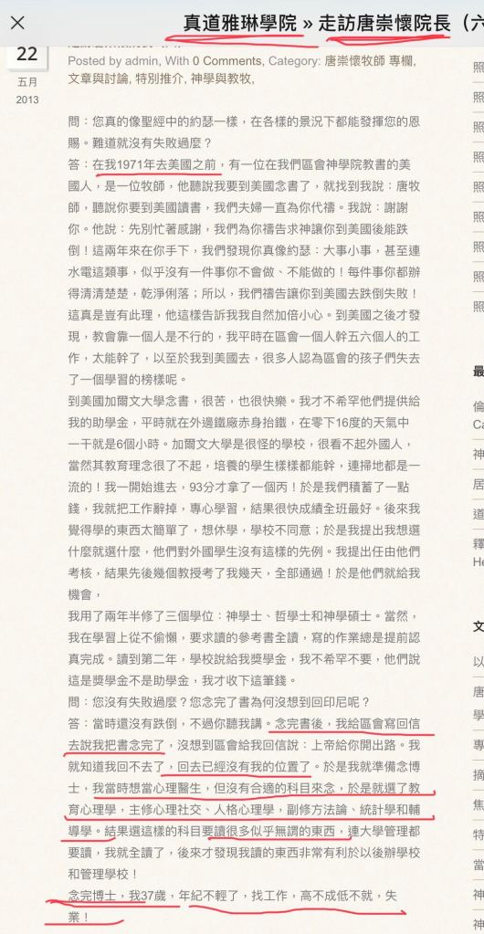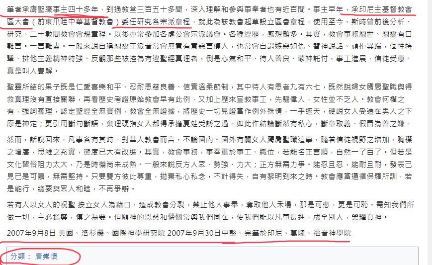 2007年,唐崇怀写了一篇文章《教会妇女圣职的再思和商榷》,在这篇文章里,唐崇怀说,“筆者承膺聖職事主四十多年”。根据上面的分析和计算,唐崇怀哪来的有四十年的圣职呢?2007年,唐崇怀 65岁,扣除他14年的生意人生,和8年的美国学生日子,这就是22年了,如果他还有四十几年承担圣职,那他就得从婴儿时期就开始担任圣职了,这岂不荒唐?如此言过其实地吹嘘自己的属灵成就,这究竟是在欺哄人,还是欺哄神呢? 文章相关部分截图如下: