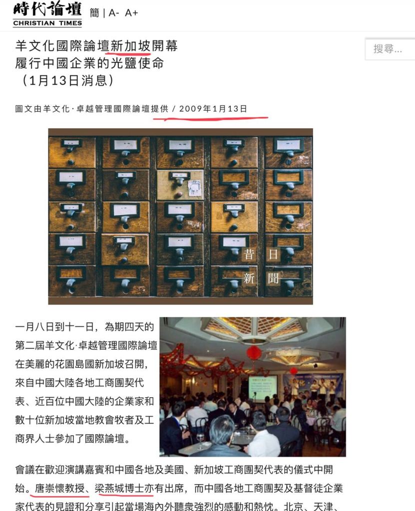 2009年,唐崇怀在新加坡还“按立一批中国教会前所未有的职场牧师、执事和长老 ”。这岂不是不按规矩乱按立牧职吗?职场不是教会,职场要牧师做什么?而且,唐崇怀又是以什么资格给别人按立?自从他29岁来美国读书,他就只是学生,生意人,神学院老师,他凭什么资格给别人按立牧职?真不知有多少“牧师”就是这么被乱按立出来的?难怪有的所谓“牧师”根本就不符合圣经对牧长所设立的条件。下面是2009年的相关报道截图: