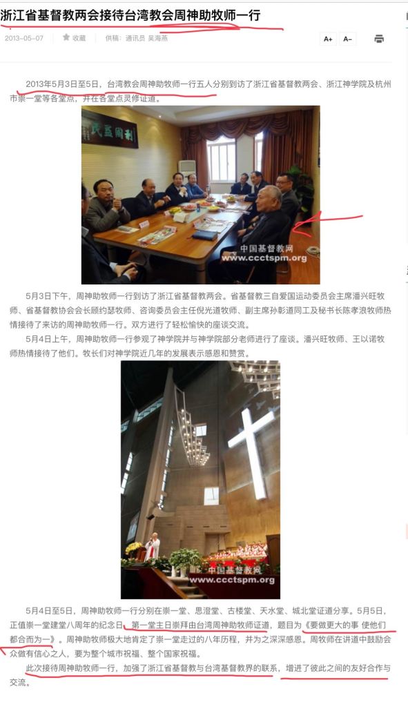 周神助的热心岂是为主而发的?周神助这位离经背道的灵恩派大头目,到处去搞合一,与天主教合一,与异端分子合一,还与三自“友好往来”(见文后附图),他这叫着为主发热心?只能说,周神助的这种无休止地扩张灵恩派的势力和地盘的热心,是颇合张伯笠的心意和喜好罢了,也符合张伯笠今年的“合一”主题。