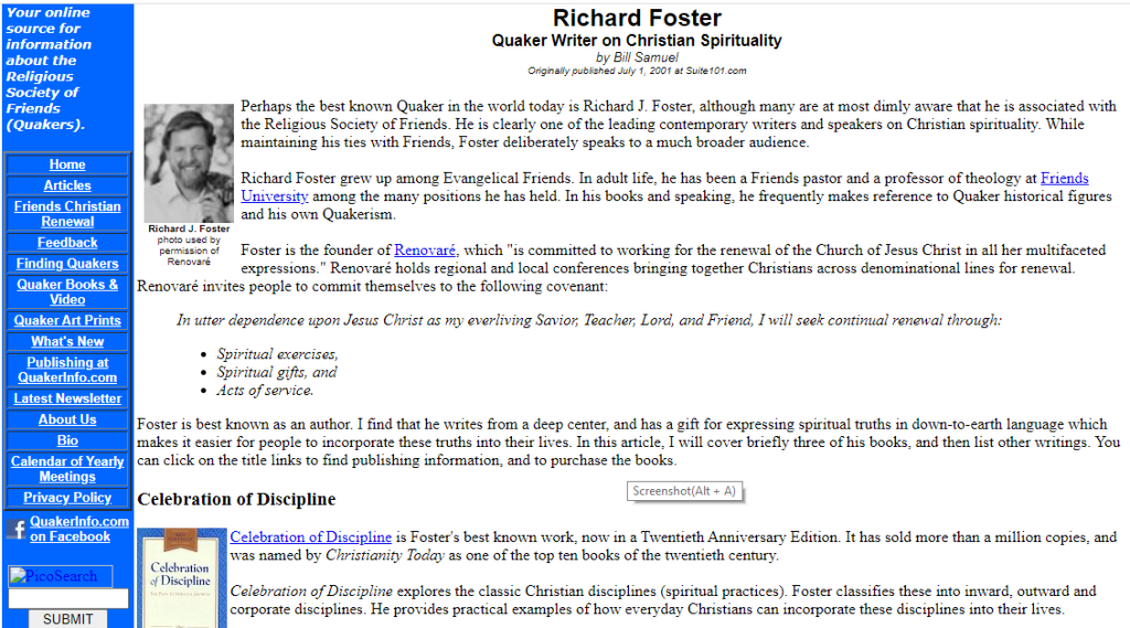 但是,傅士德的信仰背景却是异端贵格会(Quaker),也称为教友派(the Religious Society of Friends),他被认为可能是当今最著名的贵格会人士。下面是一贵格会网站对他的介绍的截图,他被称为 Quaker Writer (贵格会作家):