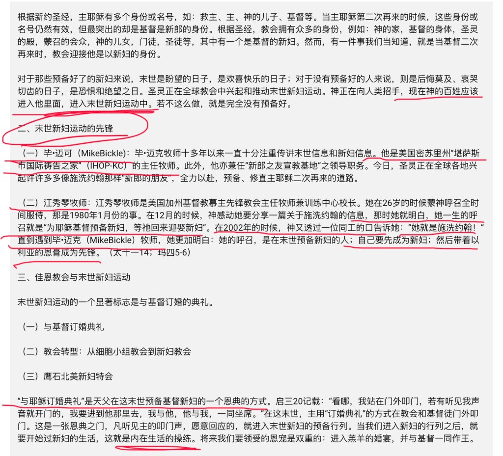 江秀琴在她的《爱火燃烧特会—进入先锋的呼召》里说道,“我曾经对新妇没有什么概念,只知道这是我的呼召,就一直在传讲这个。直到我遇见毕.迈克牧师,他常常讲末世先锋的信息,我就更明白了,预备新妇的这些人就是先锋!” (见下面原文截图)可见,江秀琴的“末世新妇运动” 是受到毕.迈克的启发和影响。毕.迈克注重传讲基督的新妇,他所讲的被称之为 The bridal paradigm (新妇典范)。