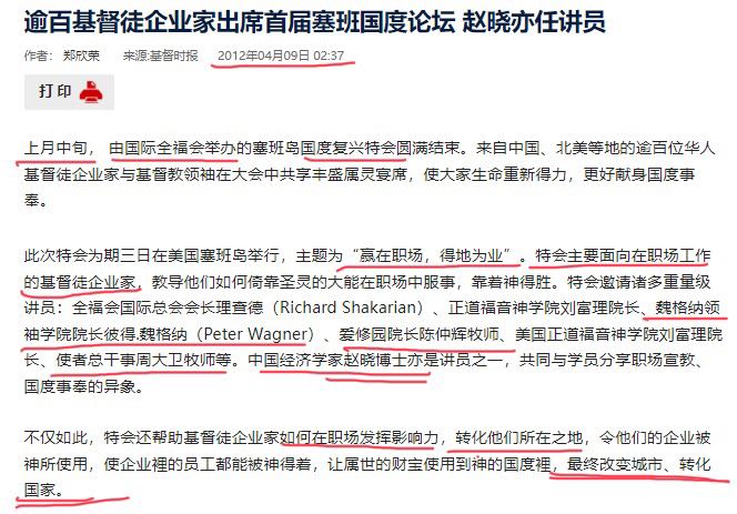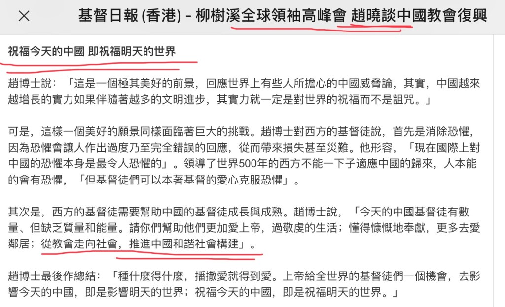 综上,简要地说,赵晓的目标和策略都不符合圣经真理,而是打着基督教的旗号,企图利用基督教,甚至是全球基督教的一些资源来为中国效力,为的是属世的梦想。