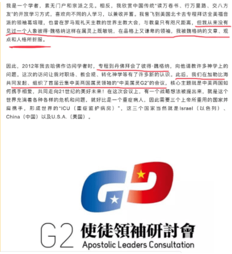 赵晓说,后来和魏格纳在加勒比海共同发起、组织了首届云集中美两国属灵领袖的‘中美属灵G2的会议’ 。但是截图下方显示的是“G2 使徒领袖研讨会”,G2 代表中美两国,美国的使徒领袖有魏格纳或NAR的使徒,不知中方的使徒领袖是谁?就算没有正式公开地说出有谁,默认的大概至少有赵晓吧,没人比他更有资格被NAR收纳和接受为他们其中的一员。