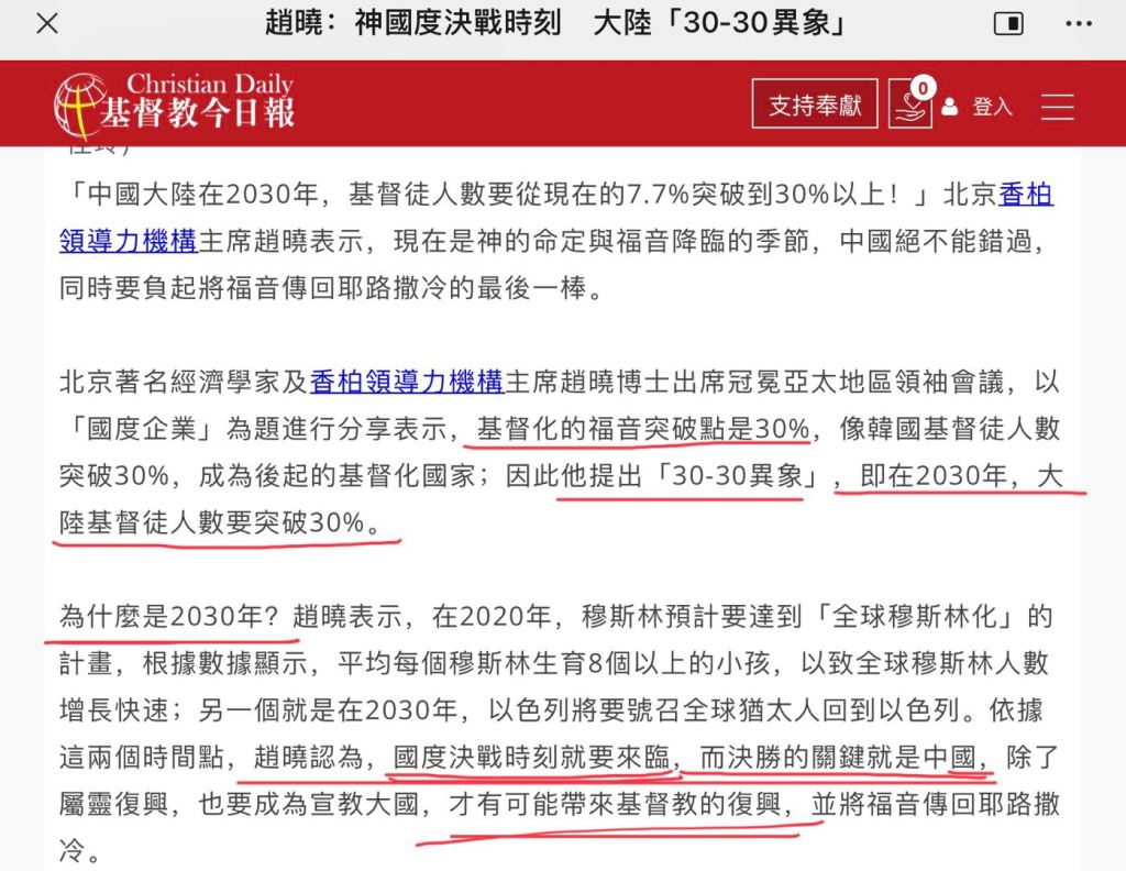 据赵晓自己说,“基督化的福音突破点是30% ”,所以为了转化中国成为一个基督教国家,就需要有30%的人口是基督徒。但是,转化中国成为一个基督教,而且是在2030年,这样的异象从何而来?符合圣经吗?圣经哪里有教导说要转化地上的国度成为基督教化的国家呢?根本就没有!更没有量化为要有30%的基督徒。