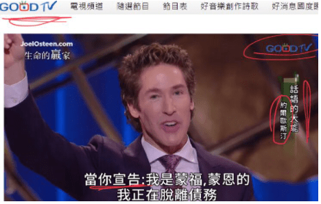 一旦站在台北灵粮堂的立场,基本上也就没什么立场了。为什么这么说呢?看看台湾的好消息电视台(Good TV )就知道了。这个电视台的执行长曾国生也是台北灵粮堂的执事会主席,也就是说,Good TV 实际上是握在台北灵粮堂的手中。连在美国臭名昭著的假师傅:约尔.欧斯汀(Joel Osteen ), 乔伊斯.迈尔(Joyce Meyer),比尔.强生(Bill Johnson)都能上这个电视台。如果说灵粮堂有立场,那也是和假师傅一个立场的。下面就是好消息电视台(GOOD TV)所播放的约尔.欧斯汀这位成功神学异端人士的“话语的大能”的异端言论的视频截图: