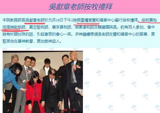 虽然这些教会都称吴献章是博士、老师,其实他早就被按牧过。 吴献章是2005年初在灵粮堂被周神助(灵粮堂体系的大家长)等人按立为牧师的,下面是当时的报道截图: