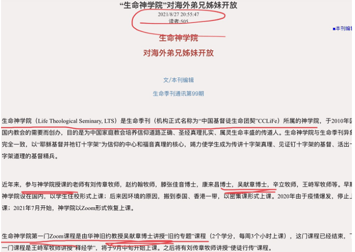 吴献章可不只是游走在台湾的灵粮体系里,连以大陆人为主要对象的生命季刊也欢迎和接受他。生命季刊的生命神学院也请吴献章来充当神学教师,那么,吴献章和生命季刊的立场一样吗?还是生命季刊不认为吴献章与灵恩派的合一不是什么大问题?这是值得去思想和观察的问题。见下面生命季刊的报道截图: