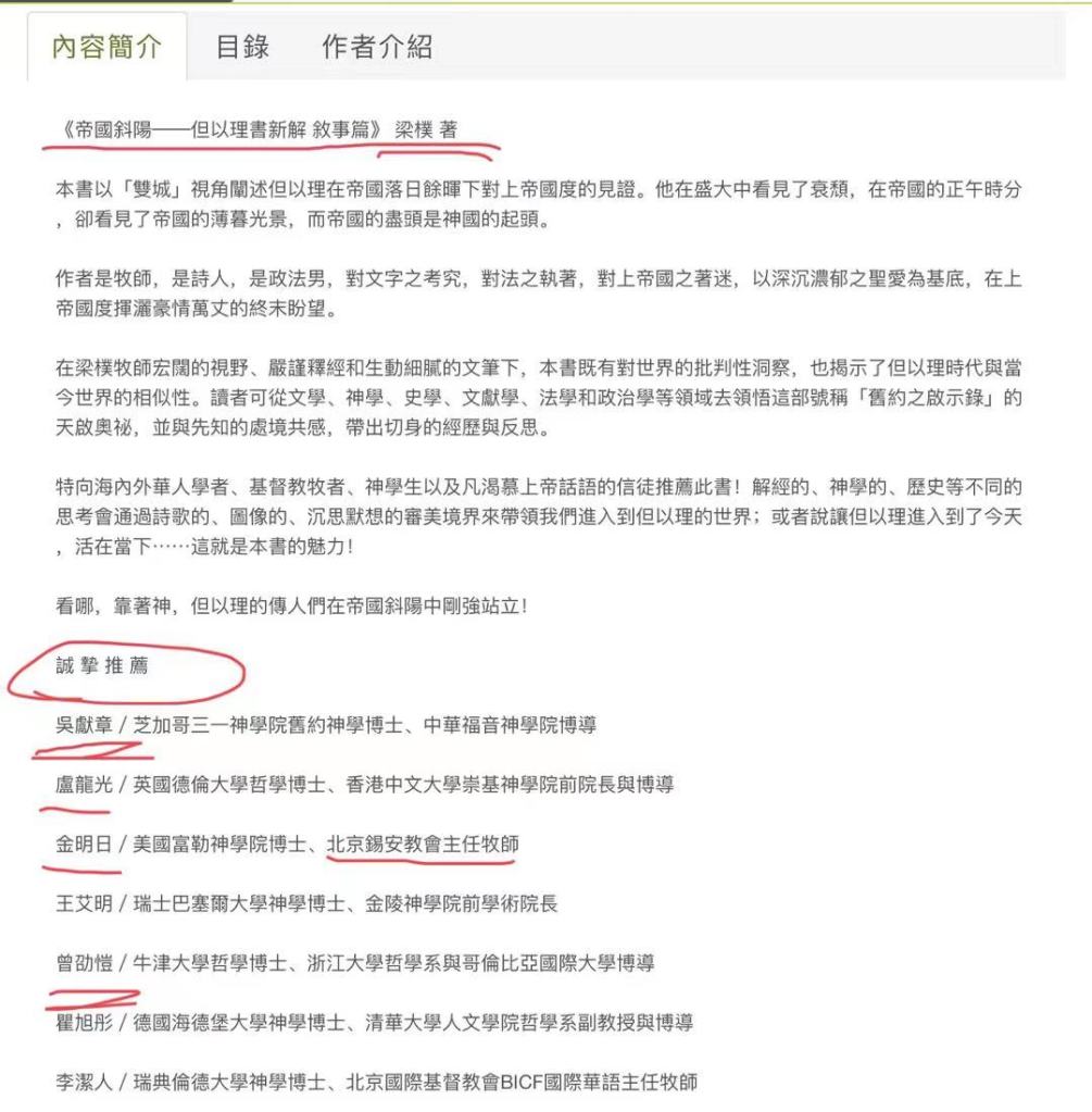 下面是梁朴的《帝国斜阳—但以理书新解》一书的介绍截图,看看推荐者名单也颇为有意思: