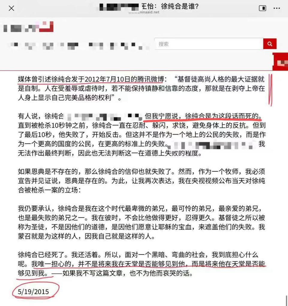 2015年5月,徐纯合被执法人员打死了,王怡就此发表了一篇文章《徐纯合是谁?》见文后所附截图。