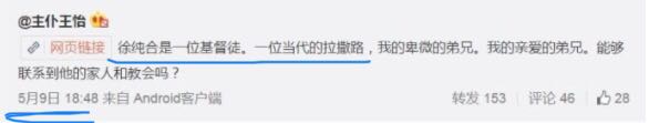 5月9日,王怡就发微博称徐纯合是当代的拉撒路,这也就等于在肯定徐纯合是位基督徒。见下面王怡的微博截图: