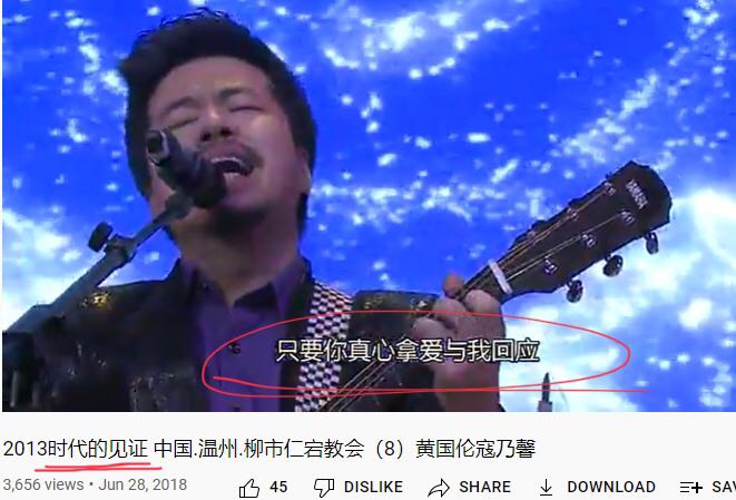 2013年,黄国伦在温州开音乐见证会,下面是他在唱他的成名曲《我愿意》时的视频截图: