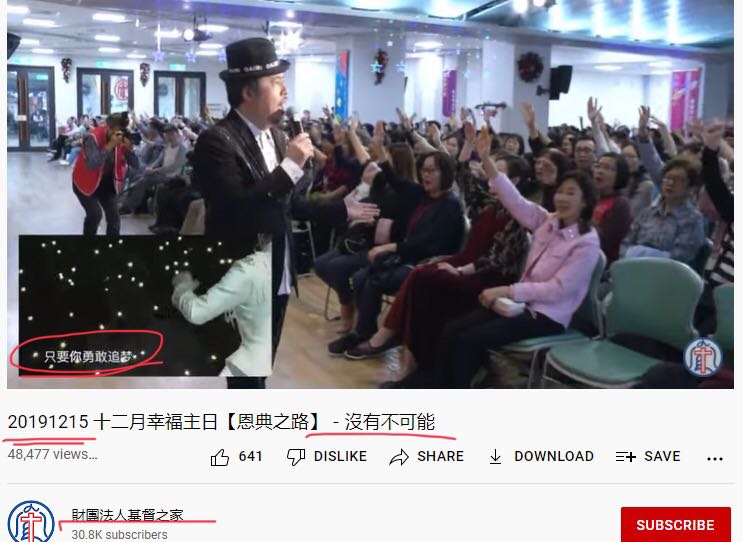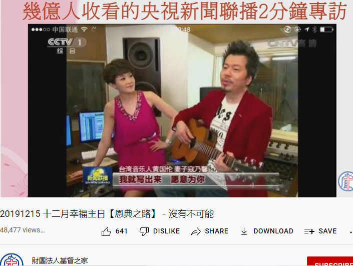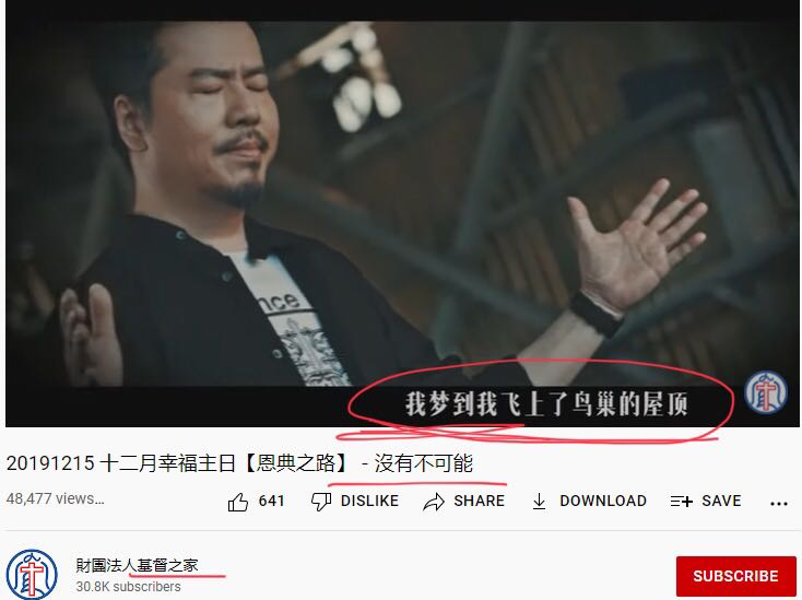 在台北基督之家“演讲”到最后,黄国伦演唱了鸟巢演唱会的主题曲《没有不可能》。歌里唱道,“怎么可能,美梦竟然成真。没有不可能,不是我天真,只要能相信,就会有奇迹。没有不可能,只要你勇敢追梦。”下面是他与听众一起唱这首歌时的画面截图: