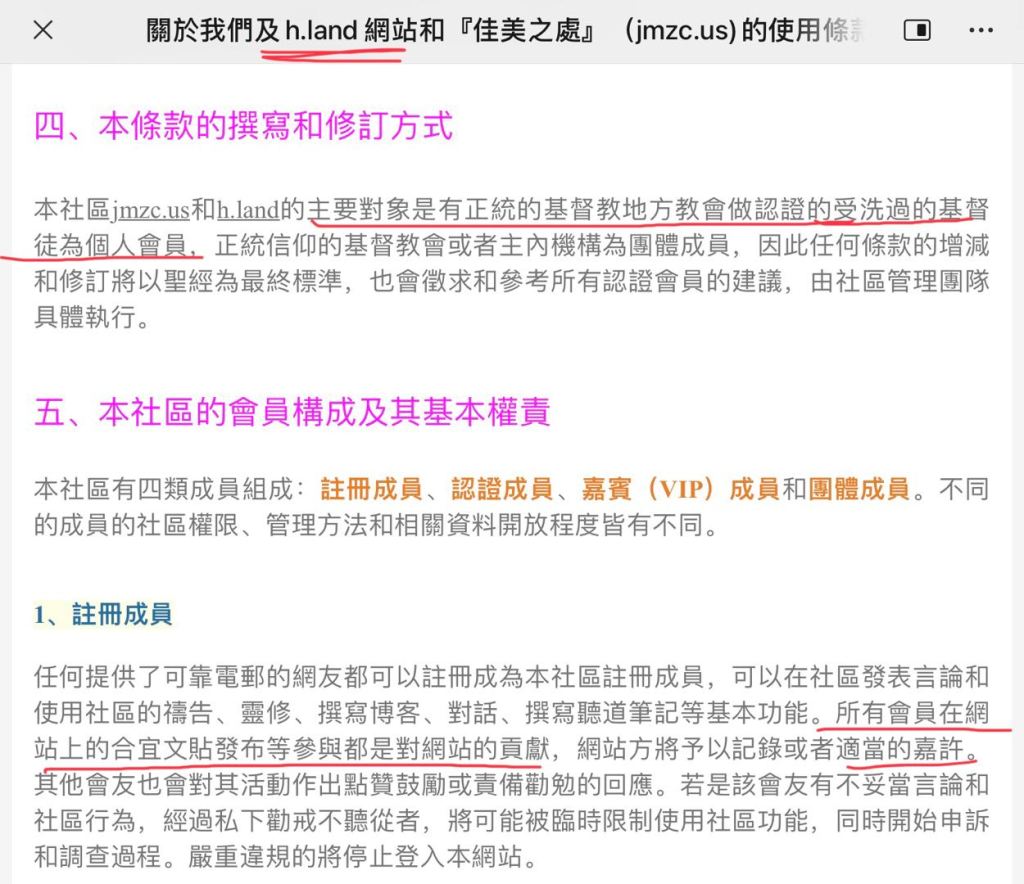 “本社區jmzc.us和h.land的主要對象是有正統的基督教地方教會做認證的受洗過的基督徒為個人會員,正統信仰的基督教會或者主內機構為團體成員。” 见下面截图: