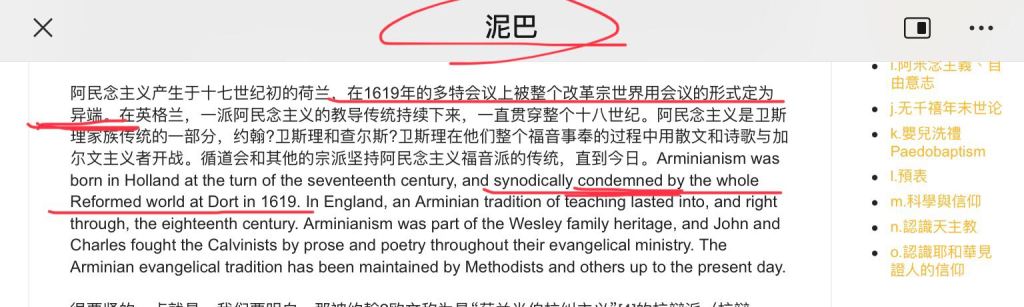 从好几年前开始,我就一再地看到和听到华人里一些所谓的加尔文主义者或改革宗人士说,多特会议定阿民念主义是异端。但这并不是事实,我亲自查看过多特信经的中英文全文,并没有看到有把阿民念主义判定为异端的内容在其中。而是看到在中文版的《多特信经》的前言部分说到,“这次会议持守加尔文主义(Calvinism)的传统,判定阿民念主义所提的上述五点是错误的看法,并完成《多特信经》” (见文后附图 1)。