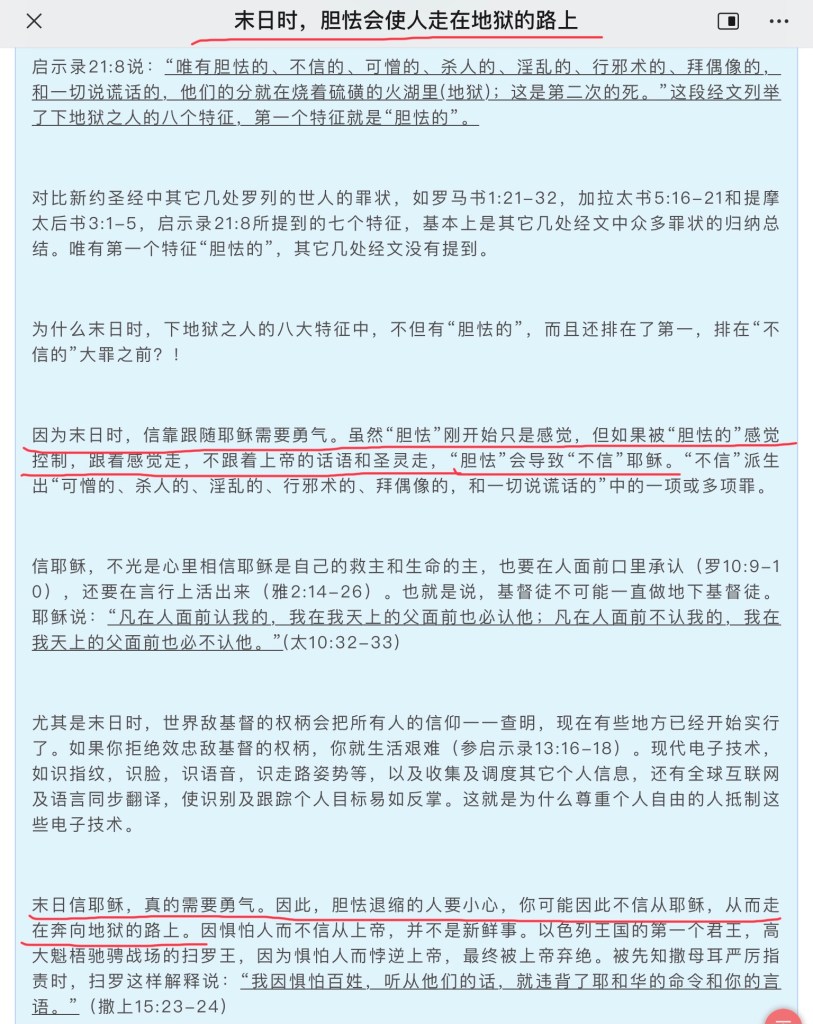 因为末日时,信靠跟随耶稣需要勇气。虽然“胆怯”刚开始只是感觉,但如果被“胆怯的”感觉控制,跟着感觉走,不跟着上帝的话语和圣灵走,“胆怯”会导致“不信”耶稣。。。末日信耶稣,真的需要勇气。因此,胆怯退缩的人要小心,你可能因此不信从耶稣,从而走在奔向地狱的路上。” (原文截图附文后)