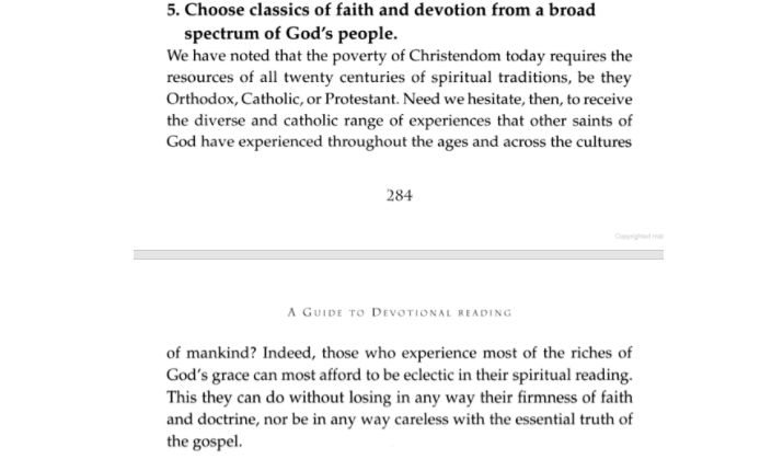 “从广大的神的子民中选择信心与灵修的经典之作:我们已经注意到,今日基督教界的贫乏,需要所有二十个世纪的属灵传统的资源,可以是正教、天主教,或是新教。对于神的圣徒在历世历代和不同文化下所经历的各种不同的经验,我们有必要对接受这些经验而感到疑惑吗?实际上,那些最多经历到上帝丰富恩典的人,是在属灵阅读上最能从各种不同的来源吸取自己所喜欢的。他们可以做到,不会在任何方面丧失他们坚固的信心和教义,而且无论如何也不会不关心福音的基要真理。”