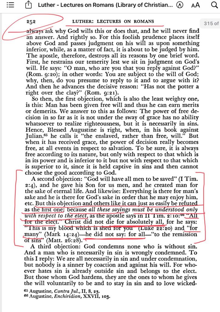 但这一反对意见和其他类似的反对意见,可以像第一种反对意见那样,轻易地被驳倒:因为所有这些说法都必须只针对选民来理解,就像使徒在提后2:10 中所说的那样,” 都是为了选民 “。基督并不是绝对地为所有人而死,因为他说”这是我的血,是为你们流出来的”(路22:20),”为多人”(可14:24),祂没有说:为所有人”使罪得赦。“(太26:28) (小草注4:基督只为选民而死,这就是有限的救赎)