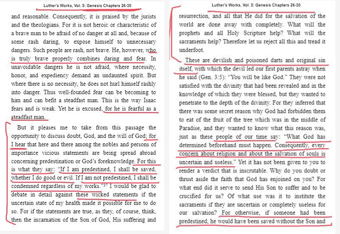 我在《路德以最强烈的用词肯定双重预定论:揭某些路德宗人士的谎言》一文已指证,路德在《论意志的捆绑》里是以非常强烈的用词肯定了双重预定论。他在《创世记讲义》的这部分里,根本就没有否定他自己在《论意志的捆绑》里所论述的双重预定论或任何的观点,更不可能把他自己清楚地写在书里的双重预定论当作是恶毒的言论!