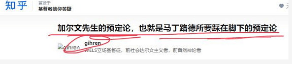 gihren (微信名:黄品霖)在他们的谎言之上,再进一步造谣,就出炉了他的更加恶劣的言论:《加尔文先生的预定论,也就是马丁路德所要踩在脚下的预定论》,制造出本不存在的加尔文与路德之间的严重分歧,如此作为用心险恶!见下面截图: