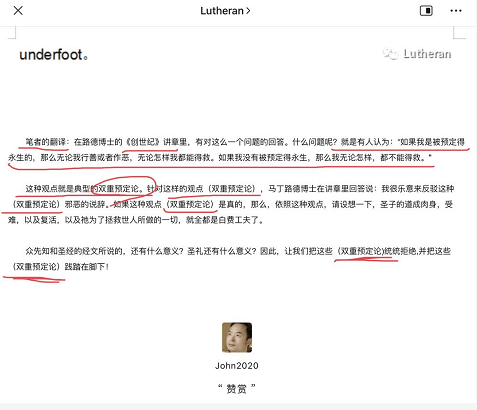有些所谓的路德宗人士声称路德在晚年的时候否定和批判双重预定论,他们所引的是路德晚年的《创世记讲义》(Luther:Lectures on Genesis )。2021年发表在 Lutheran 公号上的这篇文章《马丁路德博士对双重预定论的真实立场》,不只是谎称路德在他的《论意志的捆绑》一书里根本没有谈到预定遗弃,见我对此的揭露:《路德以最强烈的用词肯定双重预定论:揭某些路德宗人士的谎言》,而且在这篇文章的最后,作者 John2020 (微信名:英语何老师,Lutheran 群的群主)还有下面这么一段话: