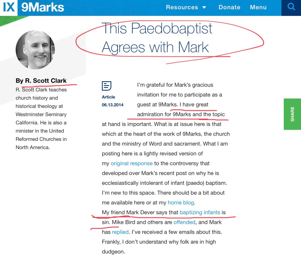 在改革宗浸信会所办的《9Marks》(9 标志)网站上,有一篇司考特.克拉克(R Scott Clark)写的文章《This Paedobaptist Agrees with Mark》(这位持婴儿洗礼的人士赞同狄马可),是有关婴儿洗礼分歧的问题。