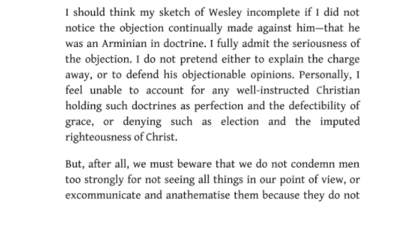 如果我没注意到那些对他(约翰.卫斯理)无休止的反对,那我对他的介绍就不完全。在教义上,他是位阿民念主义这。我完全承认那些指控的严重性。我既不为那些指控做解释,也不为他的观点做辩护。我个人觉得无法解释,任何受过良好训练的基督徒会持完美主义和恩典缺陷的教义(Doctrines of Perfection and Defectibility of Grace ),或者否定像拣选和基督义的归算。