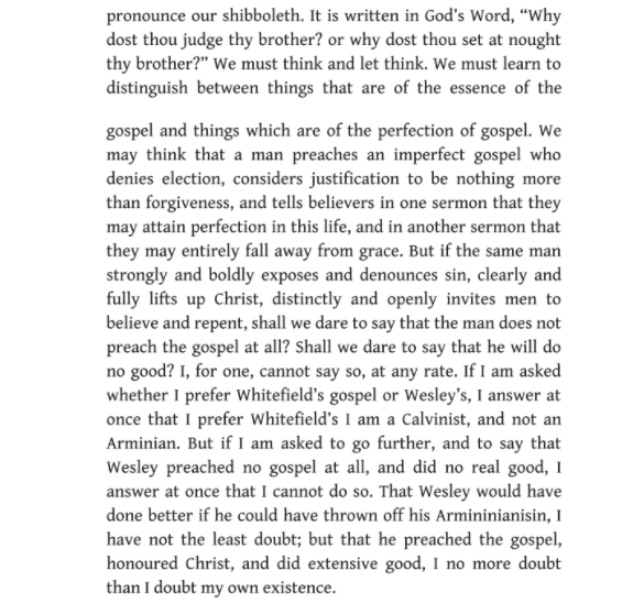 但我决不认为,在锡安的城墙里只有加尔文主义的基督徒;我决不认为,那些不持守我们的观点的人都不得救。现代阿民念主义者王子约翰.卫斯理的品格和属灵光景,遭受到最为恶劣的指控。对于他,我只能说,尽管我对他所传讲的许多教义感到厌恶,然而我对他的尊敬不亚于任何一位卫斯理会的信徒; 如果要在十二使徒中再加上两位,我想再也没有比乔治怀特腓和约翰卫斯理更适合的。