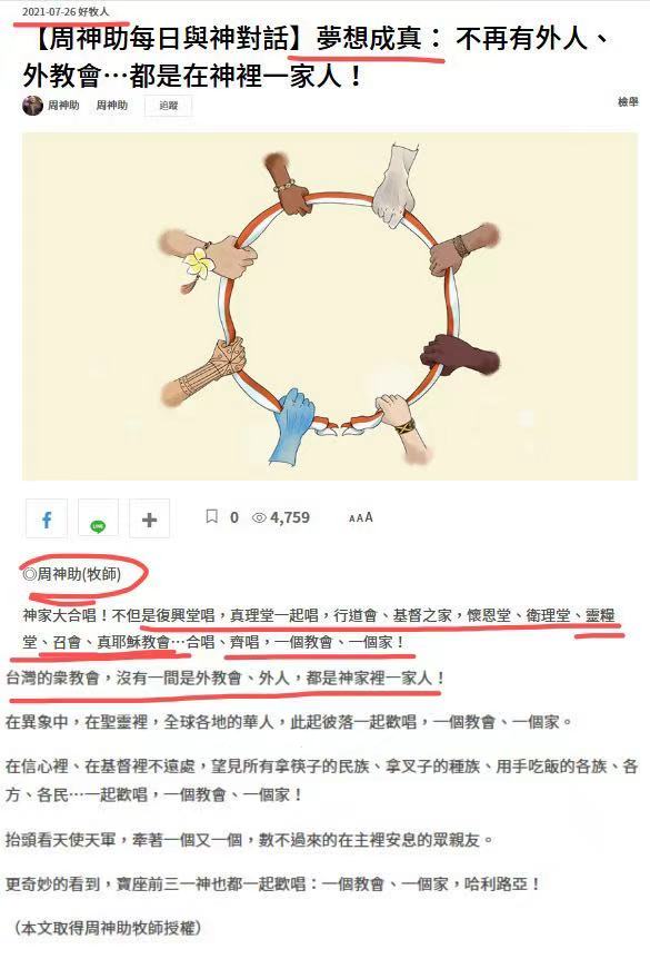 最后要指出,虽然真耶稣教会是异端,但却还是被灵粮堂的大家长周神助当作是神家里的一员。2021年7月26日,《基督教论坛报》发表了一篇《【周神助每日與神對話】夢想成真: 不再有外人、外教會…都是在神裡一家人!》的文章。在这篇文章里,周神助声称真耶稣教会也是神家里的。原文截图如下: