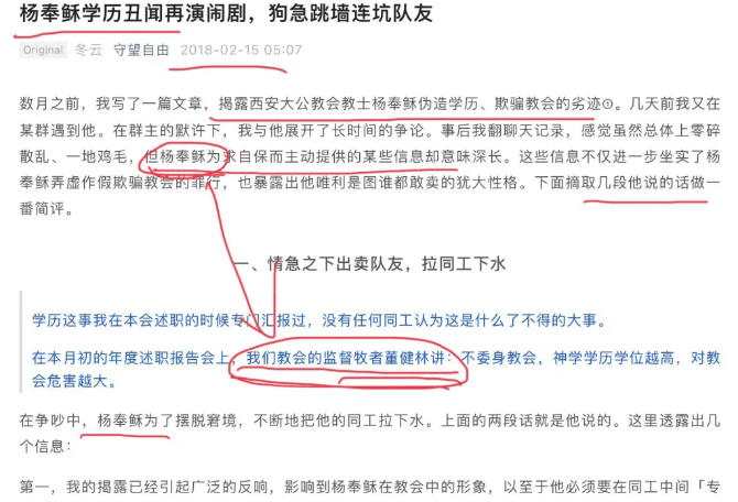 2018年,就有人发文揭发杨奉稣学历造假的丑事,杨奉稣也说了董建林是他的上司,看下图: