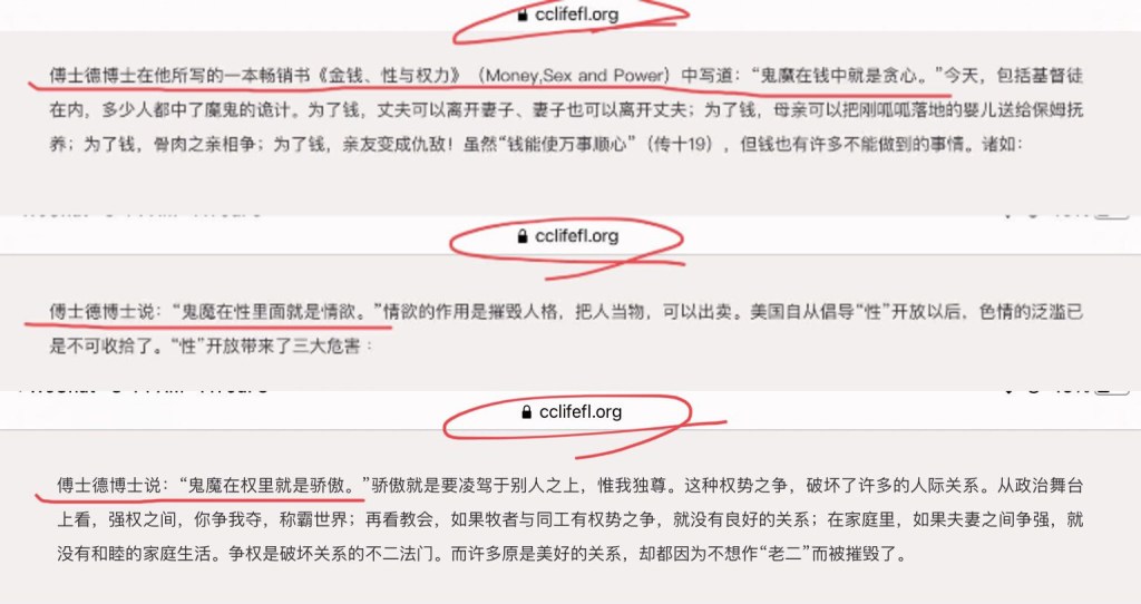 2022年4月20日 ,生命季刊发表了一篇刘传章牧师的文章:《深度文章:十字架与世界》文章里引了傅士德(Richard Foster)的书《金钱、性与权力》里的三句话,“鬼魔在钱中就是贪心;鬼魔在性里面就是情欲;鬼魔在权里就是骄傲。” 文章相关部分截图如下: